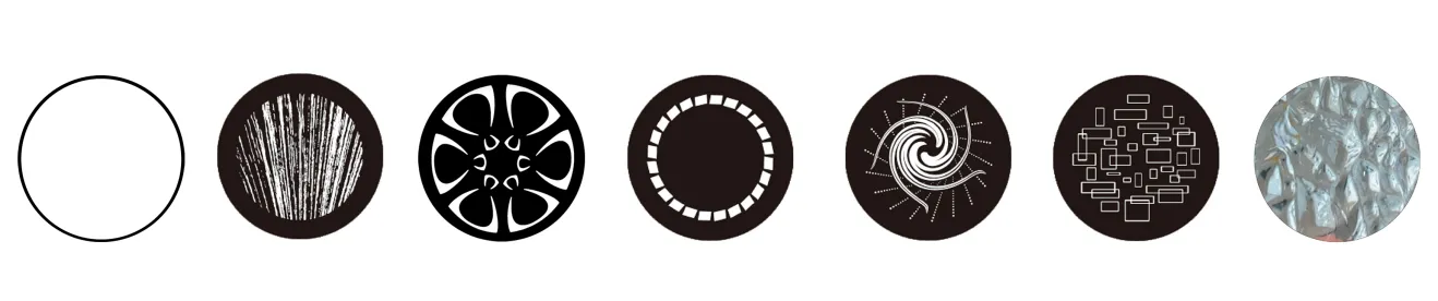 Fixed Gobo wheel: 7 Plug in fixed gobos +open position