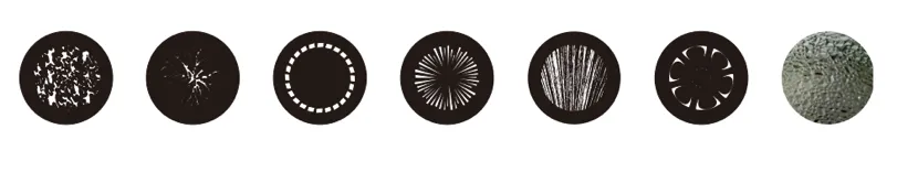 Fixed Gobo wheel: 6 Plug in fixed gobos +open position