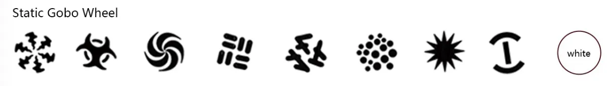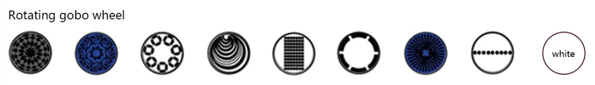 Rotation Gobo Wheel: 8 rotating gobos with outer diameter of 15.8mm, effective diameter of 11mm adjustable-speed +open