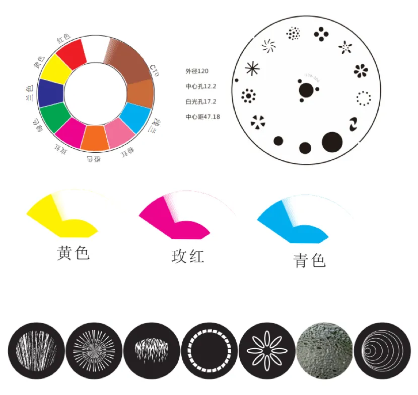 Color Wheel+Fixed Gobo Wheel+Rotating Gobo Wheel